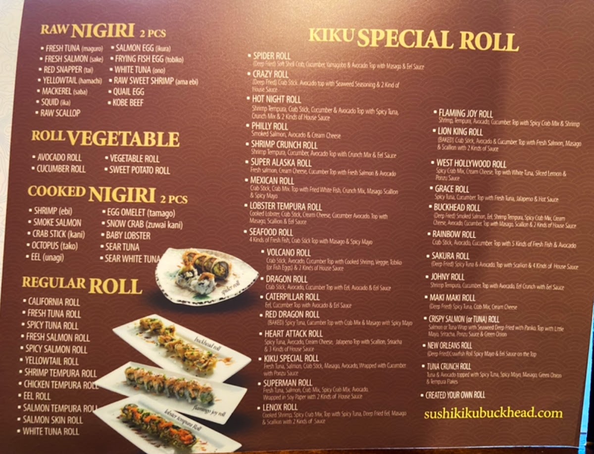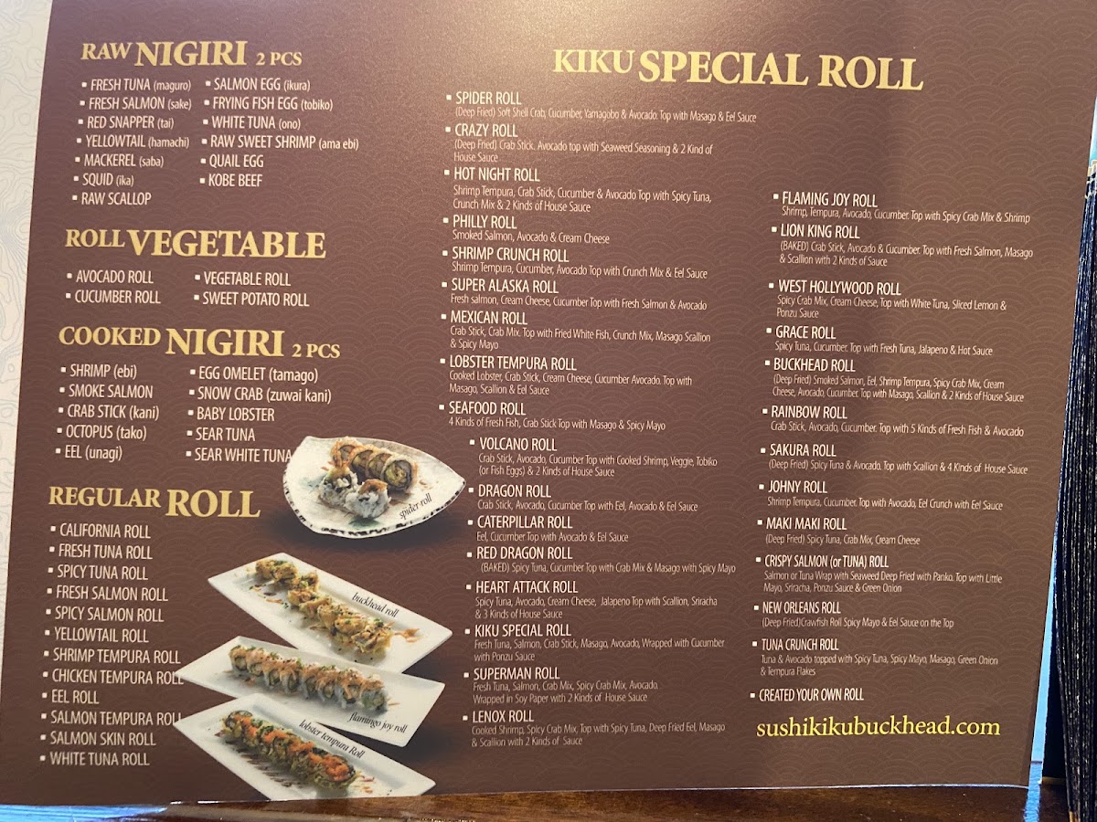 Sushi Kiku, located at 2770 Lenox Rd NE, Atlanta, is a culinary gem celebrated for its diverse menu that caters to sushi lovers and novices alike. Their offering ranges from expertly crafted cooked sushi nigiri, like the rich Eel (Unagi) and Smoked Salmon, to the fresh, raw options, including Fresh Salmon (Sake) and Sweet Shrimp (Ama Ebi). The restaurant stands out with its customization options, allowing diners to enjoy sushi free of seaweed wrap, as noted by loyal patrons.