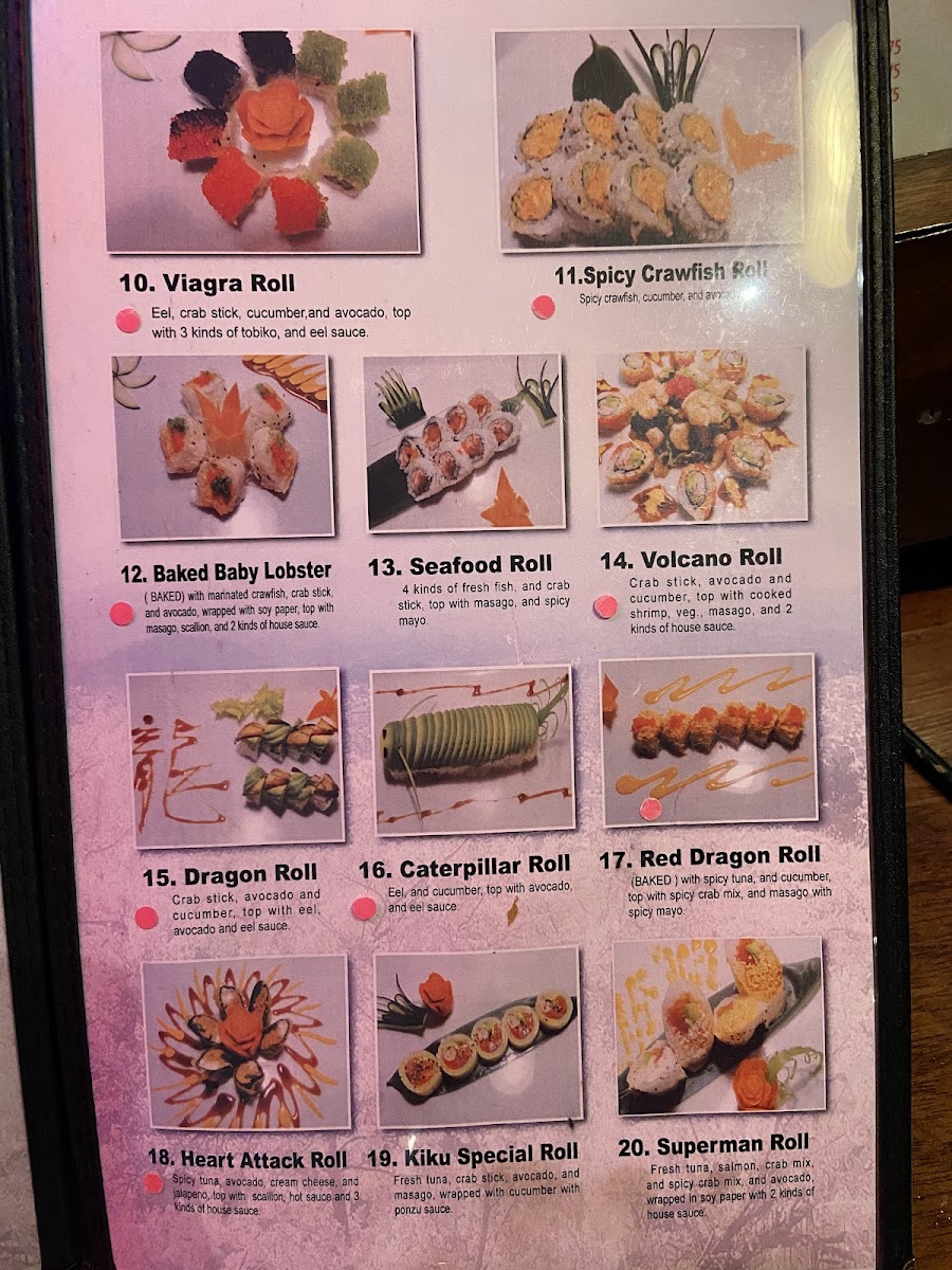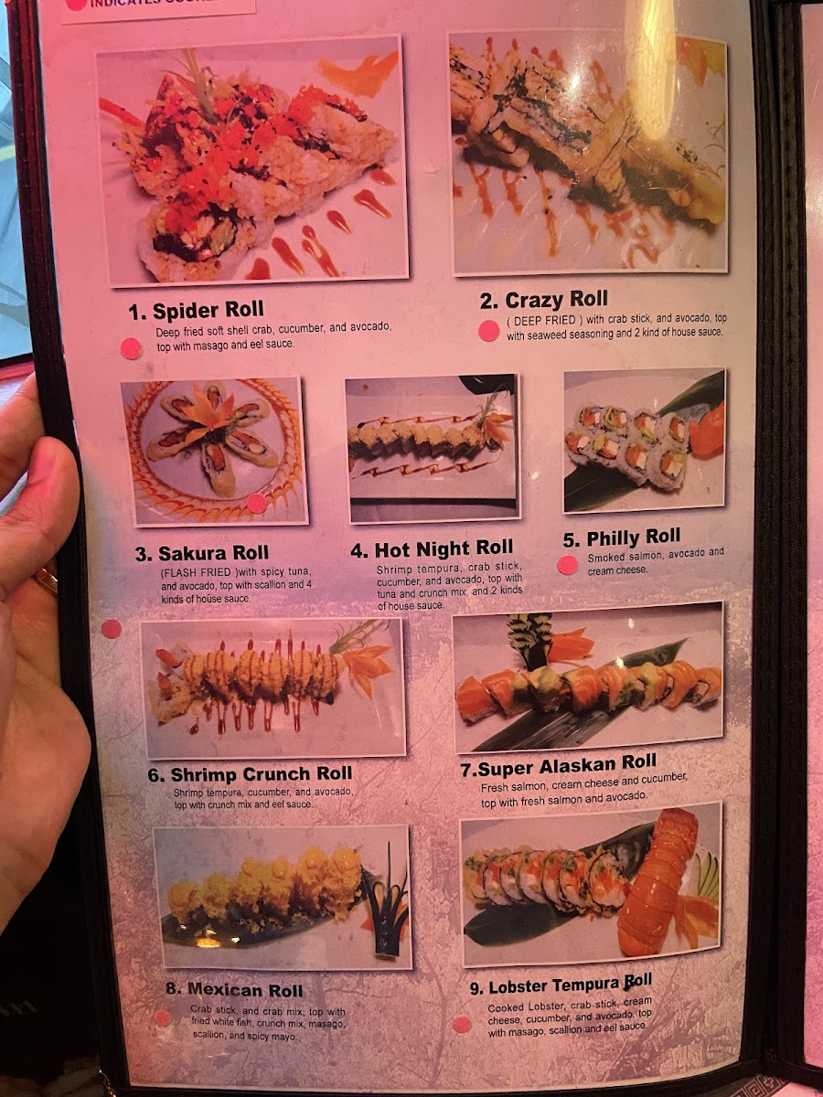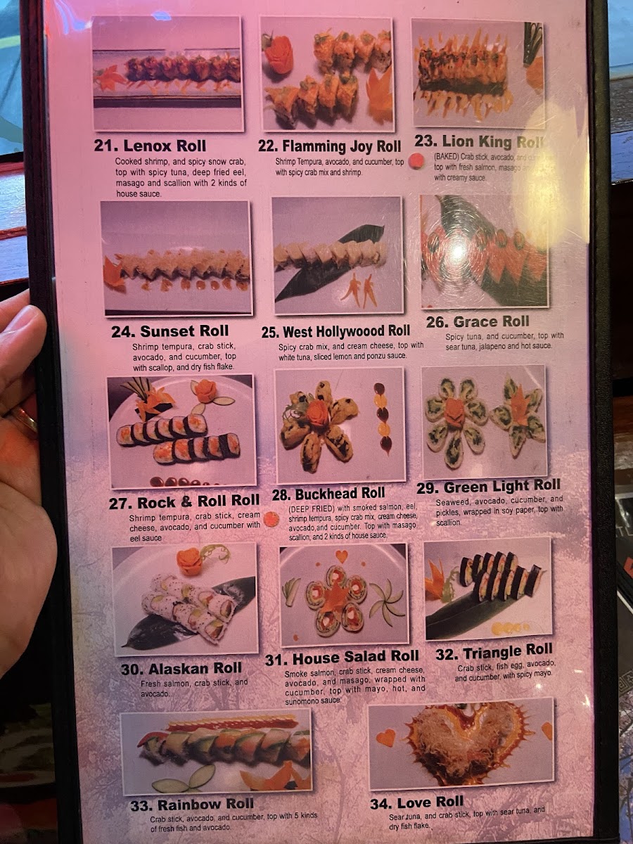 - Highlighted dishes include the savory Fried Rice and unique rolls like the Lion King and Volcano.